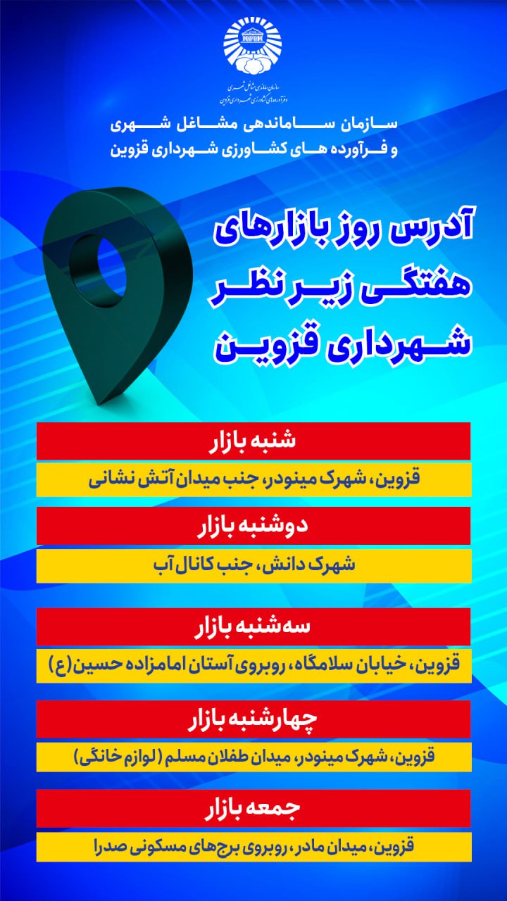 شنبه بازار (مینودر میدان آتش نشان) دوشنبه بازار (شهرک دانش جنب کانال آب) سه شنبه بازار (امام زاده حسین) چهارشنبه بازار (مینودر ،میدان طفلان مسلم، لوازم خانگی) جمعه بازار (میدان مادر جنب برج های صدرا)