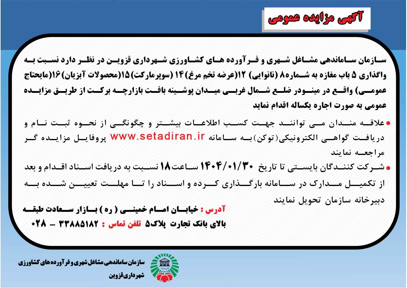 واگذاری 5 باب مغازه واقع در مینودر ضلع شمال غربی میدان پوشینه بافت بازارچه برکت